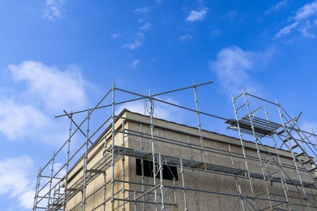 足場は、2m以上の高所作業で設置が義務付けられています。安全性を高めたり、近隣住民に配慮したりするうえで重要な役割を担い、ケガや転落事故を防止するためにも大切です。